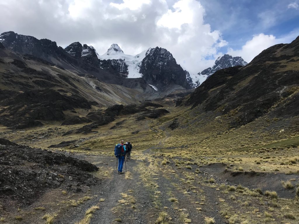 Nous commençons notre première descente vers la laguna Sistaña à 4670m par un sentier principalement en pierrier, et quelques parties en terre glissante. Une fois au bord de la lagune, nous sortons le pique nique. L’occasion de faire une petite pause repos, les filles commençaient à fatiguer après cette descente qui leur a demandé beaucoup de concentration.