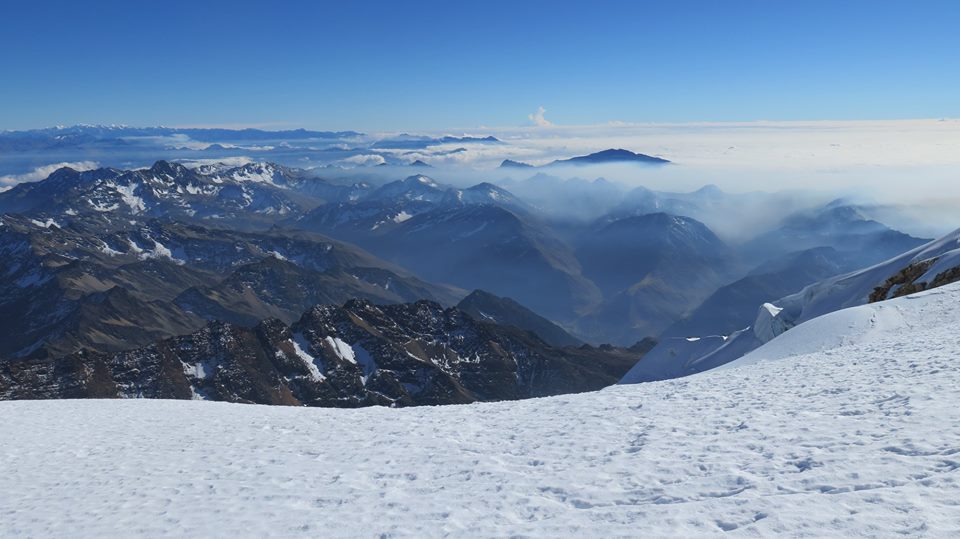Les pentes étaient raides, de plus en plus inclinées. Nous avons dû arriver sur les crêtes par des pentes à 75º à 80º. Ce fut éprouvant et je voyais les arêtes comme un but, une délivrance. Il me restait un pas pour fouler les arêtes et mon cœur ne fit qu’un tour. Mon pied glissait et je réalisai alors que je n’avais plus de crampons. Enorme frayeur. Mon crampon était accroché sous mon autre pied par la sangle. Il ne me fallait plus bouger jusqu’à ce que les gars viennent le récupérer. Un dernier pas et j’arrivais sur les arêtes ! Je pensais souffler, me remettre de mes émotions. J’étais persuadée que Ignacio nous attendait depuis un plateau confortable.
