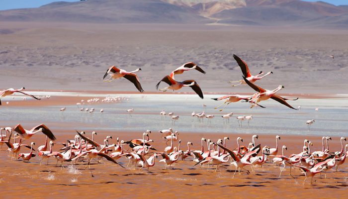 La piste longe le Salar de Capina, exploité pour son borax. La piste se prolonge ensuite jusqu´aux thermes de Polques (4.000 m). Les plus courageux pourront profiter d´un bain avec vue sur la Laguna Chalviri. Direction la frontière avec le Chili. Sur la route, on pourra apercevoir le célèbre « Désert de Dali » avec ses paysages surnaturels aux tons ocre clair parsemés de rochers isolés. Finalement, arrivée au bout du bout de la Bolivie avec la Laguna Blanca et surtout la Laguna Verde (4.300 m) avec sa couleur émeraude avec en toîle de fond le Volcan Licancabur...attention ça souffle fort. Passage d’un col à près de 5.000 m alt. avant de s´arrêter au site du « Sol de Mañana » (4.850 m alt.). Découverte de cette zone caractérisée par de nombreux geysers, fumerolles ou marre de boue. Continuation du périple afin de rallier la Laguna Colorada. Celle-ci accueille de nombreuses colonies de flamants roses qui se pavanent sous nos yeux. La piste emprunte ensuite la route du désert de Siloli. Ce dernier est composé de nombreuses formations géomorphologiques dont « l´Arbre de Pierre »…la célébrité locale. Le paysage environnant n´est pas en reste avec des montagnes multicolores. Quelques kilomètres supplémentaires sont nécessaires avant de rejoindre l´hôtel du Désert.